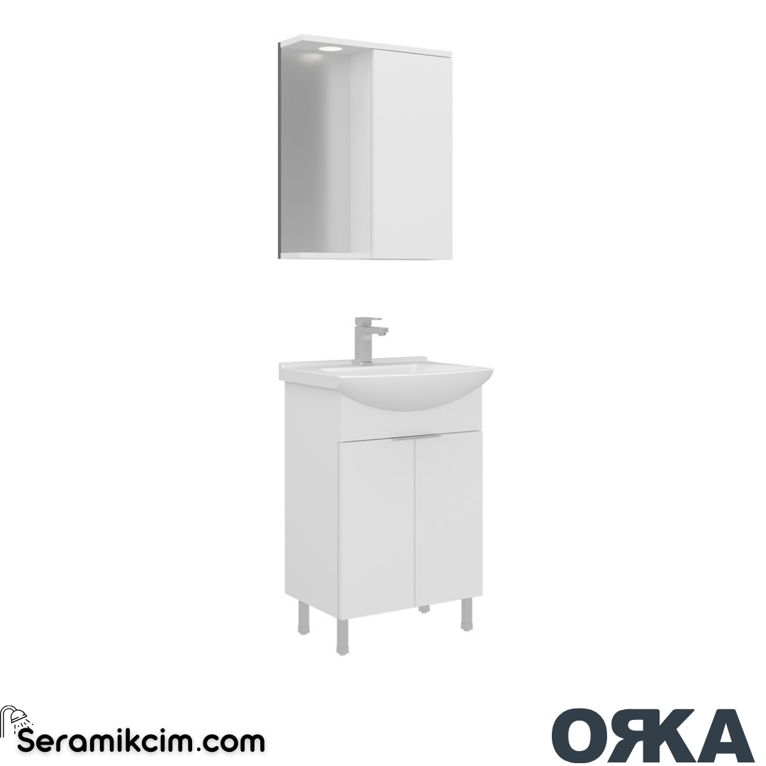 Orka Purus 55cm Ayaklı Banyo Dolabı Set Kapaklı Spot Aynalı Parlak Beyaz (ORK.1002283)